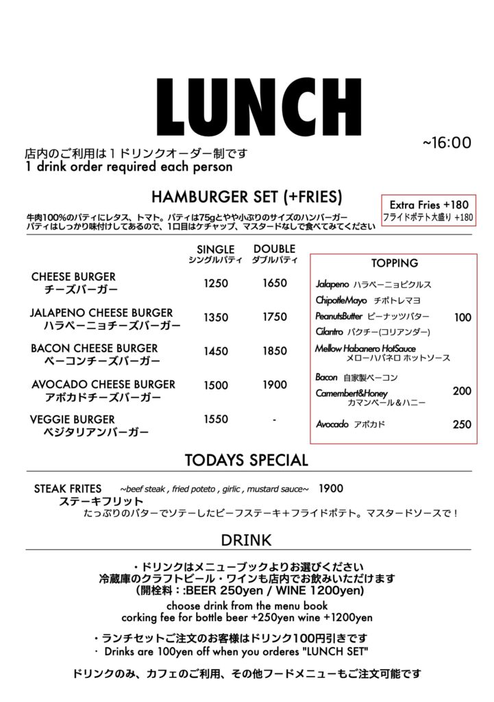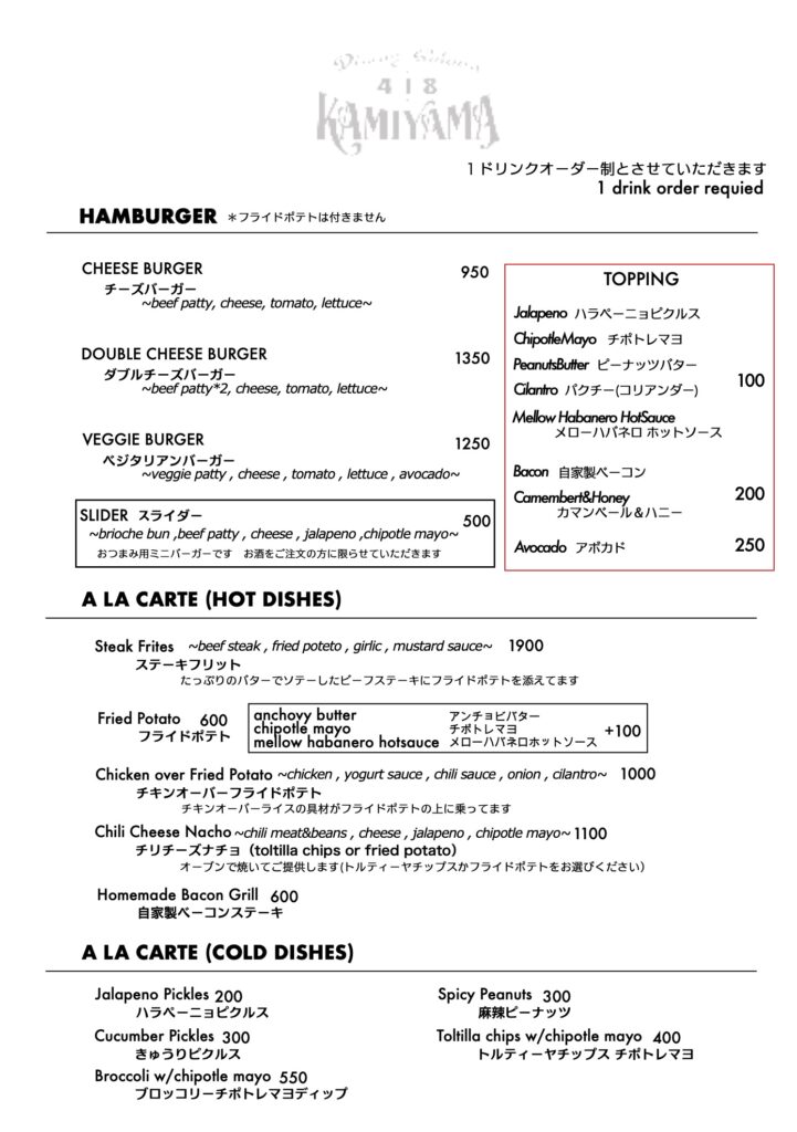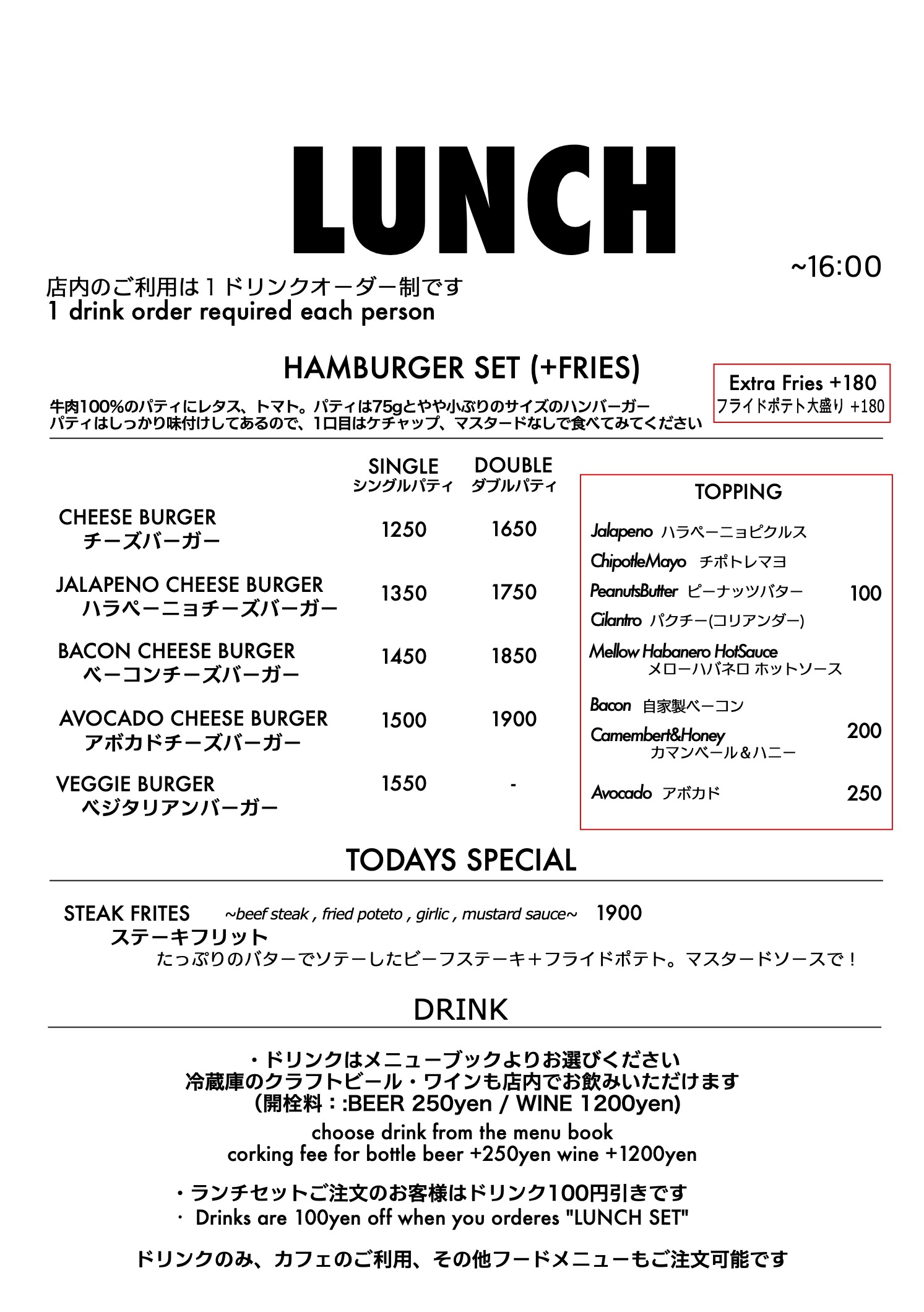 FOOD Grand Menu 週末のランチタイムにもご注文頂けます。 メニューは変更する可能性があります。 2025/11/1より原材料費高騰により、ハンバーガーの価格を50円値上げさせていただきます Weekend Lunch 土日祝 12:00〜16:00(L.O) Weekday Lunch 平日のランチは現在営業しておりません